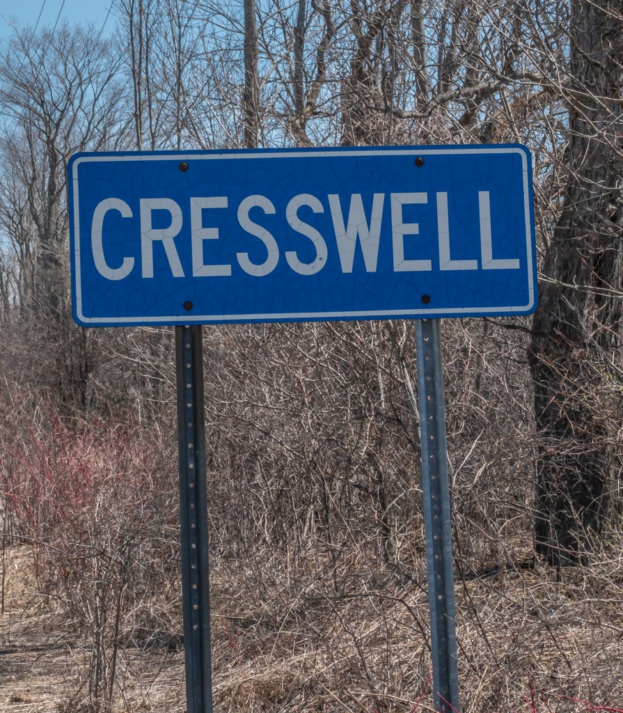 While driving along a gravel road in the Lindsay area, I came upon the little hamlet of Cresswell of which there is no mention on my road map.