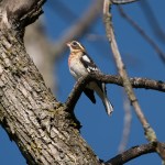 The Red-headed Woodpecker’s diet is divided between insects, including grasshoppers and others caught on the ground or in flight, and various plant species including tree nuts, berries and other fruit and seeds. They like to make their nesting cavities in dead trees, and seemed to benefit when Dutch elm disease not only provided such trees, but also the larvae, in the wood, of the beetles who were the vectors for the fungus that caused the disease. But they still are much rarer than I remember from my childhood, when they frequently would be found on wooden telephone poles.