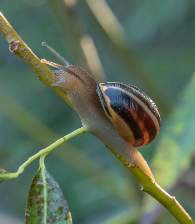 The Brown-lipped Snail (Cepaea nemoralis) is named after the brown band of colouring found around the opening of the shell. It is one of the most common species of land snail in Europe, and has been introduced to North America. This snail is comparatively slow-growing, usually taking three years to develop from an egg to a breeding adult. The life-span for this species is up to seven or eight years. In winter, the snails may hibernate, but can become active again during warm spells. (iNaturalist.ca)